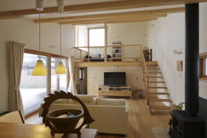 北海道産のカラマツに比べて油分が多いという話だったと記憶しているのですが、若干赤みが少なく、節や年輪の入り方も少しおおらかな感じでとても気にいって立て続けに数件の家で採用しました。